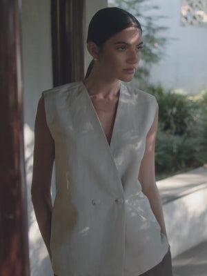 이탈리아산 코튼 블렌드 소재로 제작된 Elodie 탑은 베스트와 탑의 중간 형태로, 구조적인 테일러링과 부드러운 여성미가 공존하는 디자인입니다. 섬세한 V넥라인과 허리 뒷부분의 엘라스틱 밴드가 자연스럽게 허리를 잡아주며, 투 버튼 여밈과 프런트 요크 디테일이 세련된 실루엣을 완성합니다. Harper 팬츠와 함께 매치하면 완벽한 셋업 스타일을 연출할 수 있습니다.