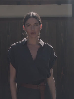 부드럽고 자연스러운 드레이프감이 돋보이는 브러시드 텐셀 소재로 제작된 Nadel 톱은 럭셔리한 여성미와 스포티 시크함을 동시에 담은 아이템입니다. 고정된 랩 스타일의 프런트가 프리턱처럼 연출되는 엘라스틱 밴딩 허리로 이어져 감각적인 실루엣을 완성하며, 대비되는 뒷밑단과 스쿱 셔츠테일이 자연스럽게 풀어진 분위기를 더합니다. 카라와 포켓 등 셔츠적인 요소와 여유로운 반소매 디자인이 조화를 이루어, 어디에나 어울리는 세련된 스타일을 선사합니다. Cabas 스커트와 함께 매치하면 완벽한 리조트 룩을 연출할 수 있습니다.