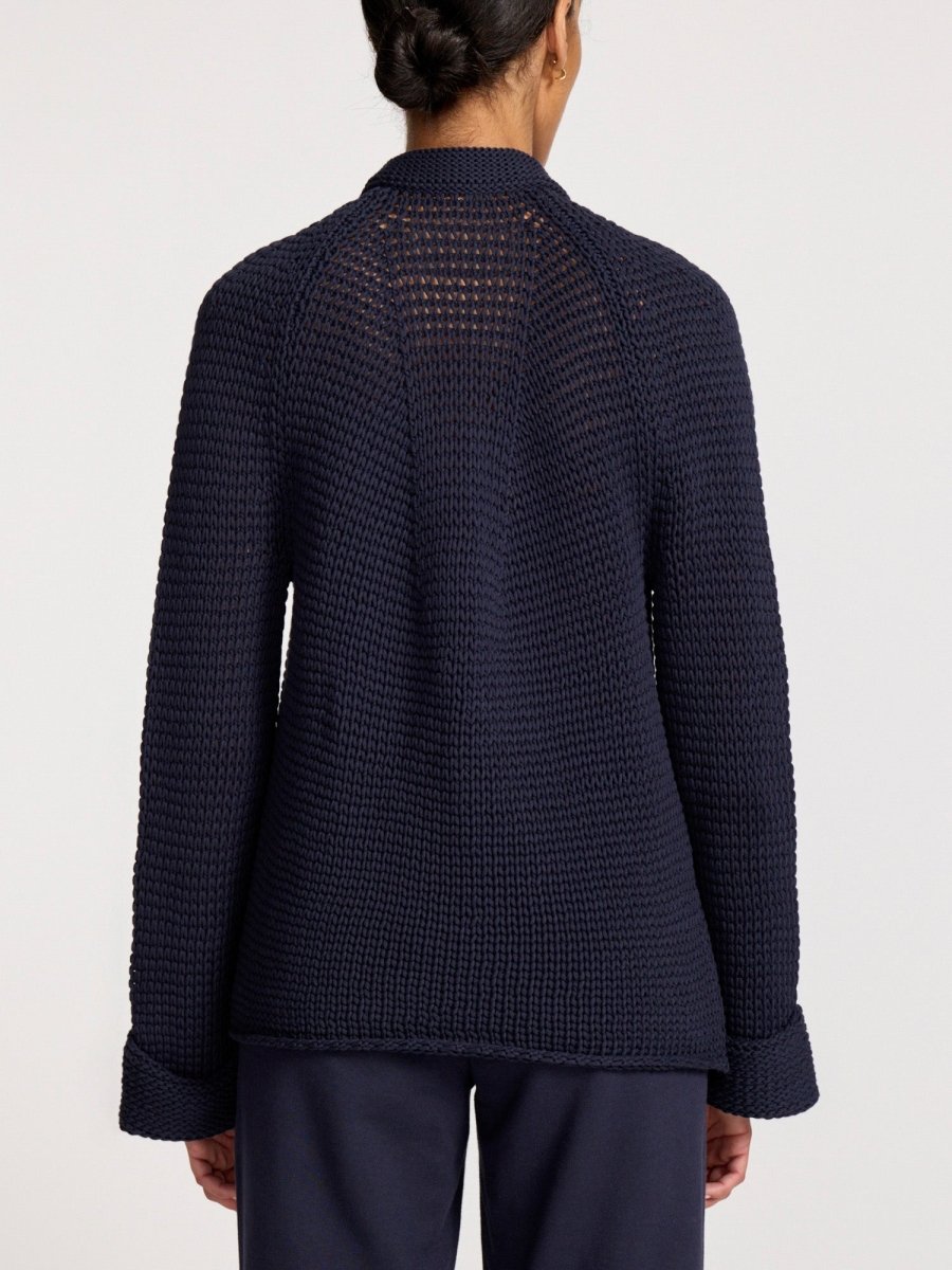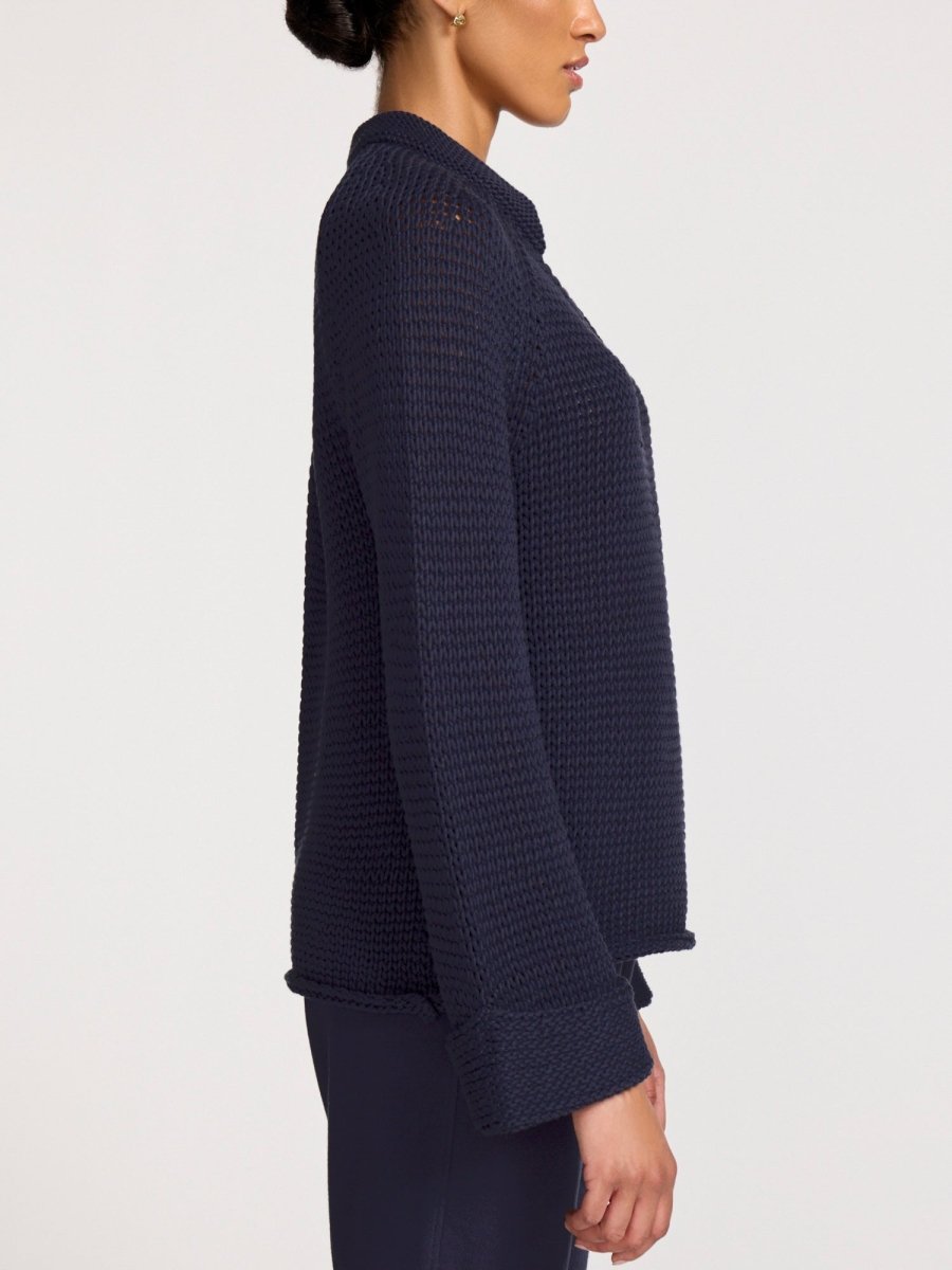 One of the most special sweaters in the collection, our Aria Popover is the epitome of effortless femininity. In a gorgeous allover, open stitch that is accented by engineered stitch details throughout, there is a textural element that adds dimension. The shape of this knit is everything…designed to skim the body for a touch of sensuality, the bell sleeves that culminate in a deep, turnback cuff add a sculptural element that is casual, yet statement-making. In a super soft cotton blend yarn, you will never want to take this sweater off.