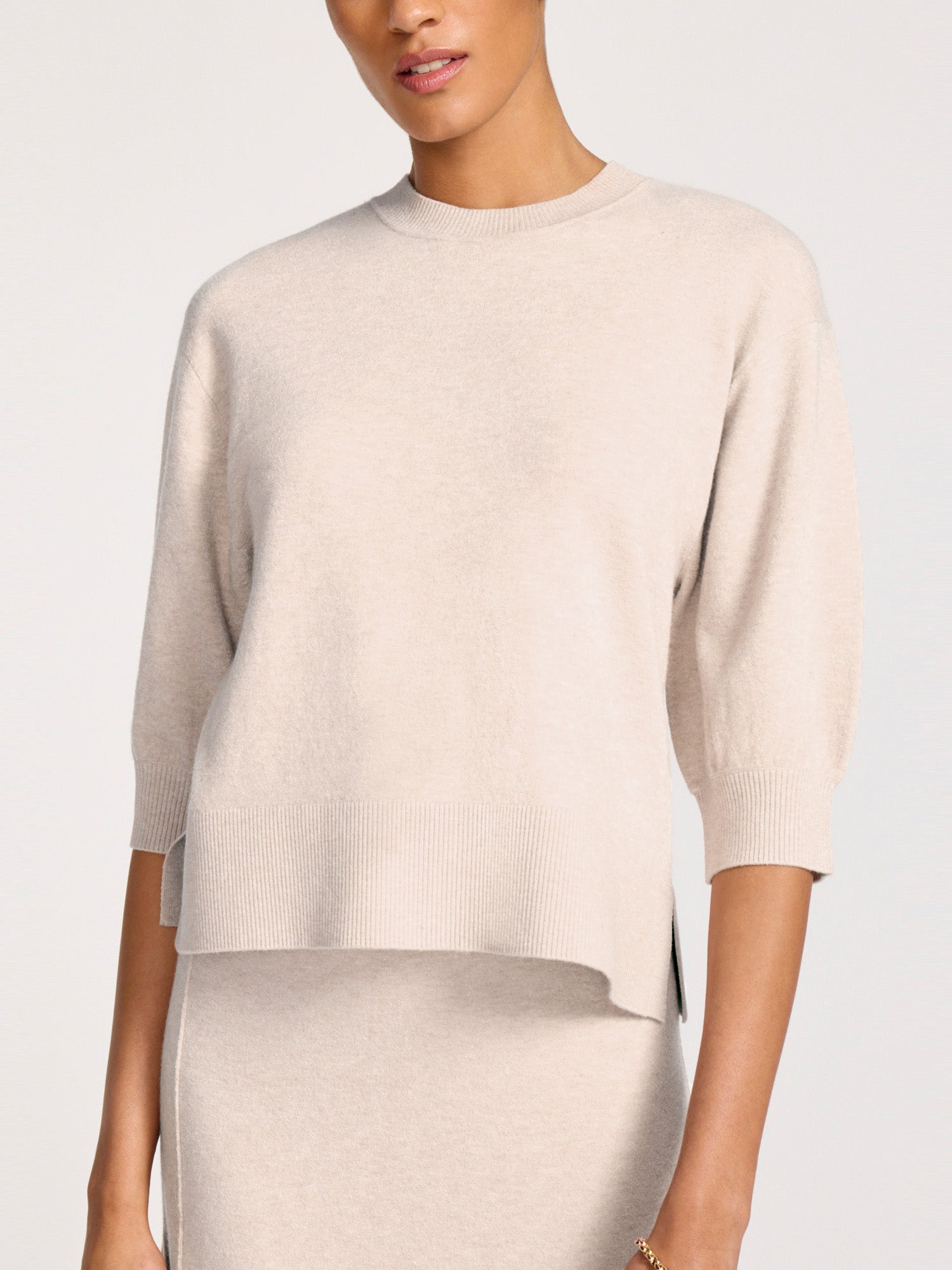 Soft meets structured. The Casia Top is crafted in a cozy new yarn blend and features shirred sleeves and side splits, perfect for effortless tucking. Pair back to the Bay skirt for head-to-toe elegance.