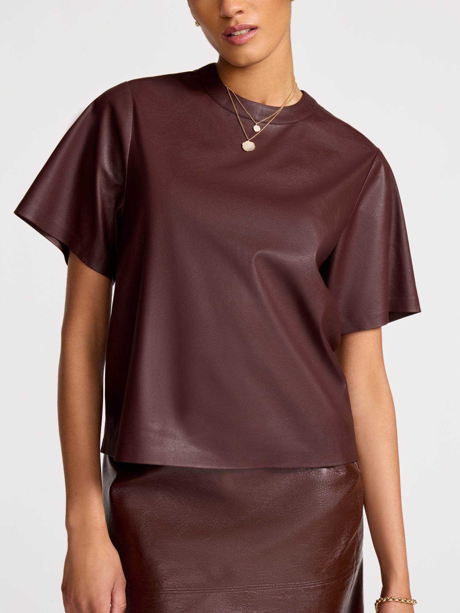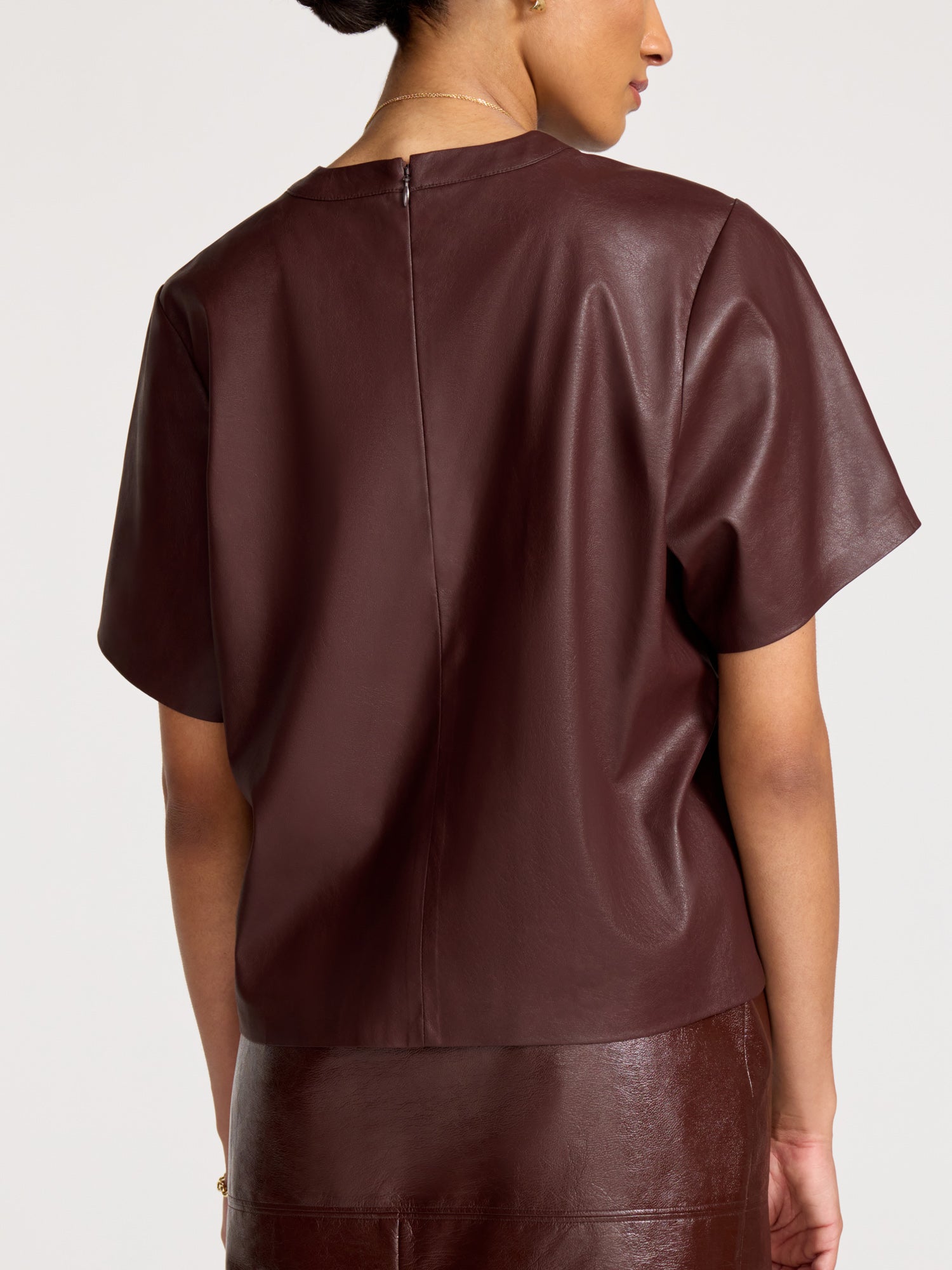 Modern and sculptural, the Miles Top in supple vegan leather redefines the classic tee. Its boxy shape and invisible back zipper offer a minimalistic style with edge.